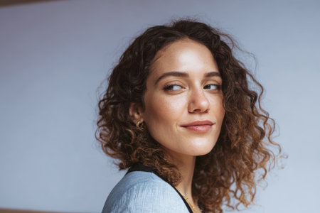 A woman stands in a space with soft lighting. She has curly hair and looks back, showing a slight smile on her face. The background is muted and neutral.
