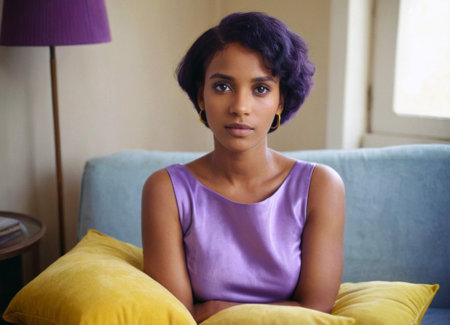 Elegant young woman in a cozy home setting, radiating natural beauty and confidence. Perfect for lifestyle, fashion, or interior design projects.