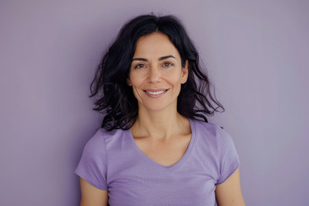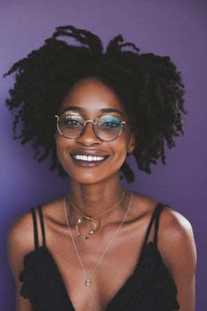 A young woman with curly hair expresses joy while smiling brightly. The vibrant purple background enhances her happiness, creating an uplifting and minimalist aesthetic.