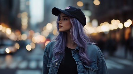 Young woman with lavender hair stands in city street at dusk, wearing denim jacket and cap, surrounded by glowing lights