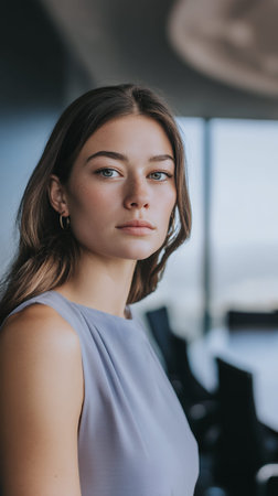 A young woman with freckles and blue eyes looks directly at the camera with a neutral expression. She is wearing a light blue sleeveless dress and a gold hoop earring. The background is blurred, suggesting an indoor setting like an office or conference room.
