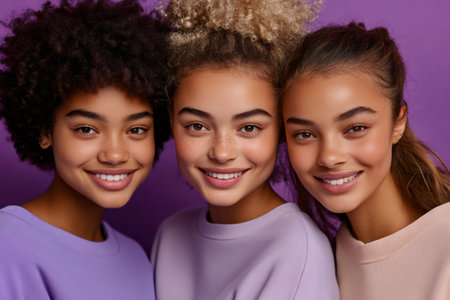 Headshot of three young women of different ethnicities with perfect skin and beaming smiles standing close together against a vibrant purple backdrop