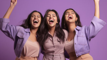Three attractive stylish young women embracing and laughing while standing against grey background : Generative AI