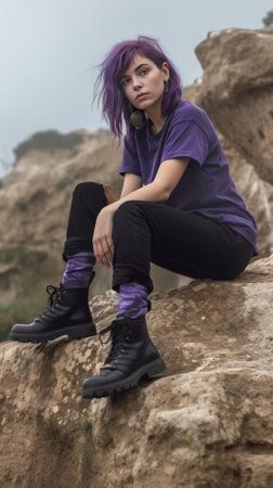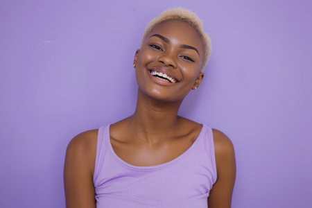 Playful and lively young woman with a stylish blonde pixie cut against a purple background