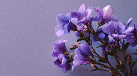 A cluster of stunning purple azalea flowers showcases delicate petals and lush green leaves, beautifully contrasting against a soft pastel background, creating a serene atmosphere.