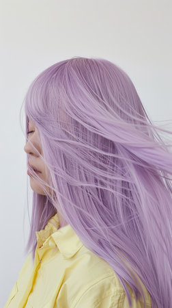 Artistic portrait against a dreamy gradient background blending from soft pink to lavender.