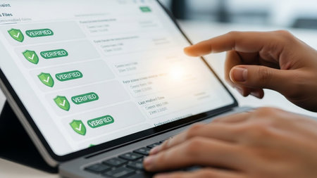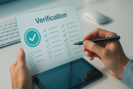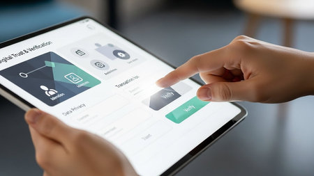 A person's finger touches a tablet screen displaying digital identity and transaction verification options.