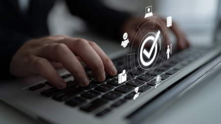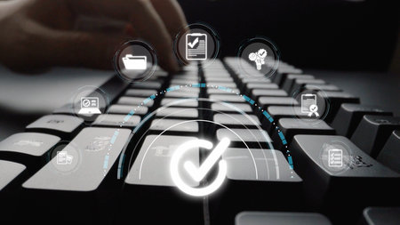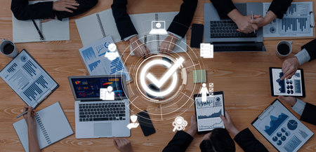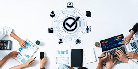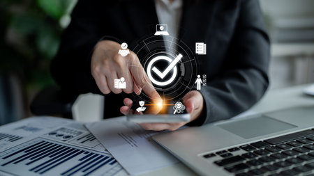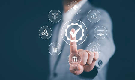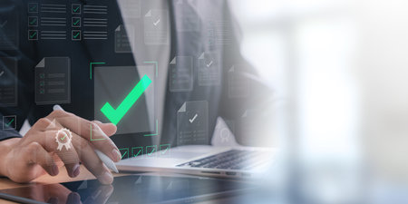 Quality Assurance Concept, Quality Checklist, Businessman Checking Electronic Documents on Digital Documents, Paperless Office, Quality Assurance and Guarantee Digital Forms Online