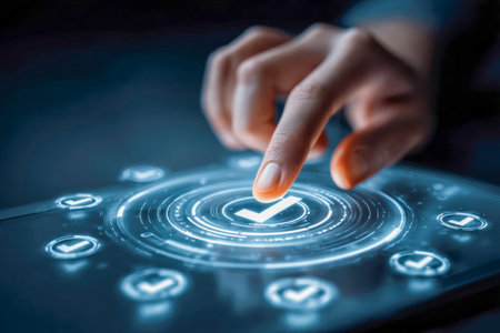 A hand interacts with a sleek, illuminated digital panel, tapping radiant checkmarks that symbolize innovation in automated approval systems and cutting-edge interface de