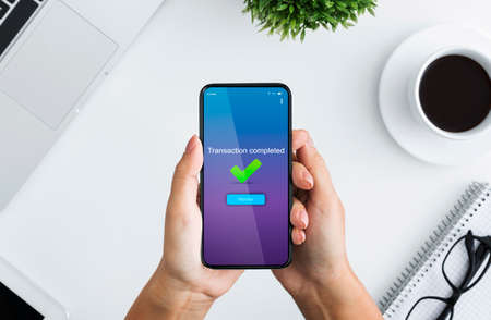 Fast Money Transfers. Woman Holding Smartphone With Transaction Completed Message On Screen, Sitting At Desk In Office, Top View