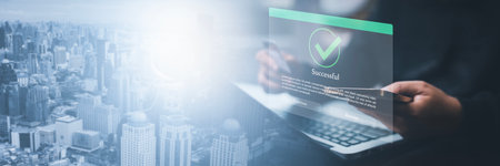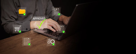 Business people tick correct mark and Approve Data online for quality assurance, Data check list and correct mark for guarantee, Data management concept.