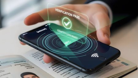 Smartphone displays NFC verification pass and identity confirmed over a passport. Clear details a...
