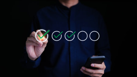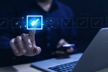 Finger touching virtual checklist with checkmarks on screen for digital certification or task approval in modern business concept