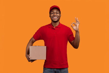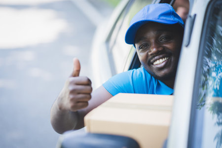 African male postal delivery courier man holding delivering package boxs and cardboard