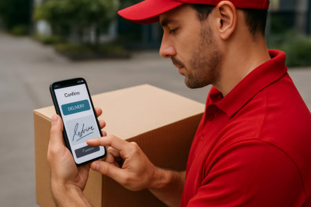 Delivery man holding a package and confirming a digital signature on a smartphone for a successful delivery