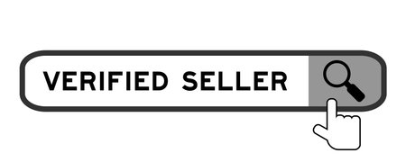 Search banner in word verified seller with hand over magnifier icon on white background