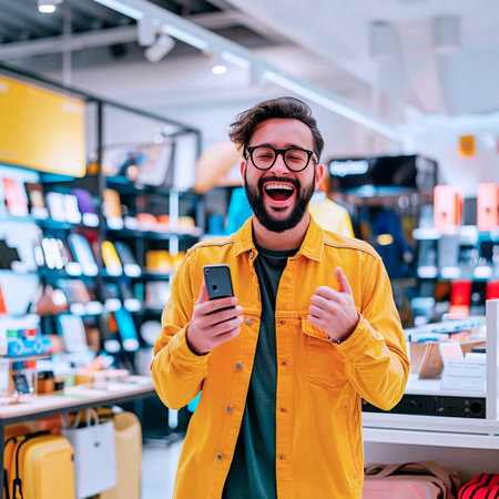 Cheerful young man in eyeglasses holding smartphone in store