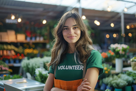Cheerful young female volunteer working at flower shop, surrounded by vibrant flowers and plants. Community service