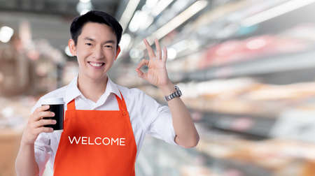young smart attractive asian male coffeeshop business owner hand sign ok with credit card online purchase order online from home concept asian apron uniform smile warm welcome for appllication order