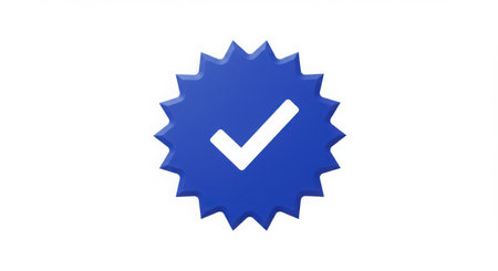 A 3D rendered blue starburst badge with a white checkmark inside. The badge has a slightly raised effect and is isolated on a clean white background.
