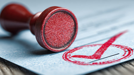 Red rubber stamp rests on blue document, leaving checkmark impression. This symbolizes approval, validation, and official documentation, evoking sense of trust and confirmation