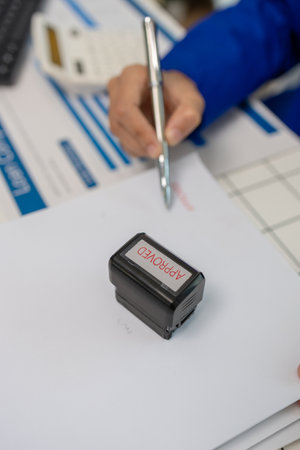 Manager hand putting stamp approved on document in office closeup