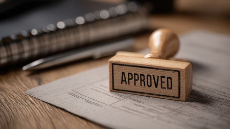 Wooden stamp with 'Approved' text on documents, with pen and notebook in the background, symbolizing authorization and business processes in a workspace