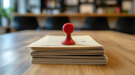 A vibrant red rubber stamp sits prominently atop a stack of documents on a wooden table, symbolizing approval and organization in a modern office.