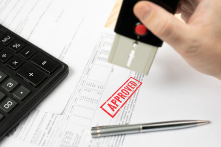 A person is stamping a stamp that says Approved on it. The stamp is on a piece of paper