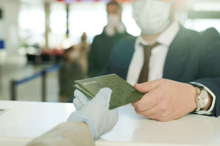 Gloved hand of female receptionist giving back passport of elegant businessman over reception counter after registration before flight