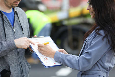 Contract signing close up shot. Customer sign papers in dealership office, client buying car or purchasing property