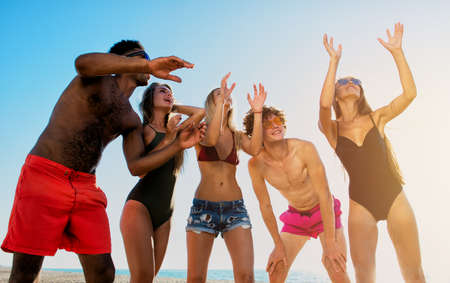 Group of happy friends having fun on the beach. Group of young people having fun on the beach.