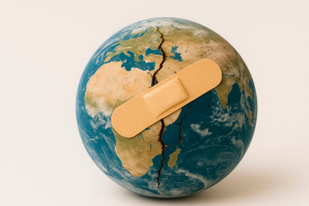 High angle of nurse bandaging head of wounded civilian man in refugee shelter, copy space