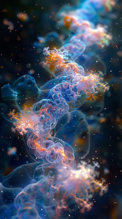 Close up view of a molecular RNA chain enveloped by various viruses showing intricate biological structures and interactions.
