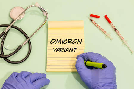 Omicron Variant, Handwritten note in a notebook by a virologist, medical accessories on a pastel green table top