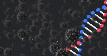 Image of virus cells over dna and black background. health and medicine during coronavirus covid 19 pandemic digitally generated image.