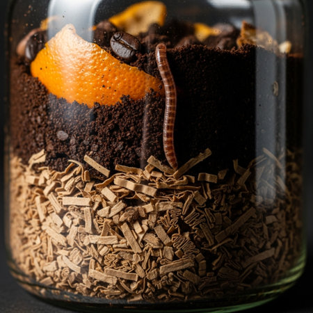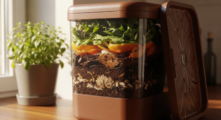 close-up of worm farm layers with kitchen scraps, created with generative ai