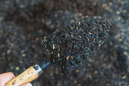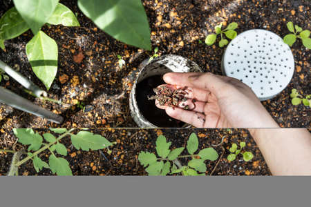 hand preparing planting soil with rice husk ash