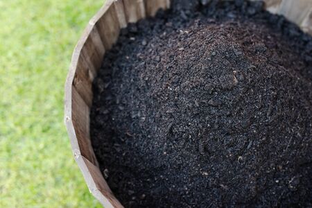 Close up of compost in plastic container with soil, composting concept