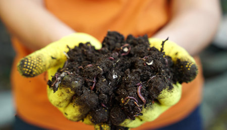 Hands cradle rich, dark soil teeming with earthworms, emphasizing the importance of soil health and fertility for sustainable agriculture and gardening. the image highlights the symbiotic relationship between organisms and soil vitality.