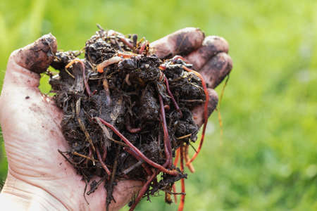 Overhead view of hand holding clumps of red wrigglers earthworms against plants at background. They are used in vermicomposting to improve soil quality