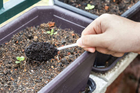 Coffee grounds being added to baby basil plant as natural organic fertilizer rich in nitrogen for growth