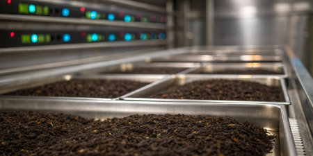 Dark leaves for black tea are spread out in stainless steel trays inside a processing facility. The environment is organized, with modern equipment visible in the background.