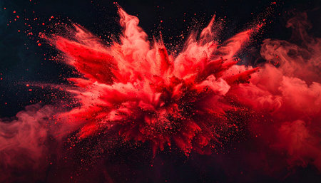 A fiery red powder cloud explodes with fine particles against a dark canvas, creating a dynamic effect.