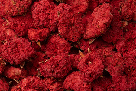 Vibrant red beads and textures: captivating close-up of intricate patterns.