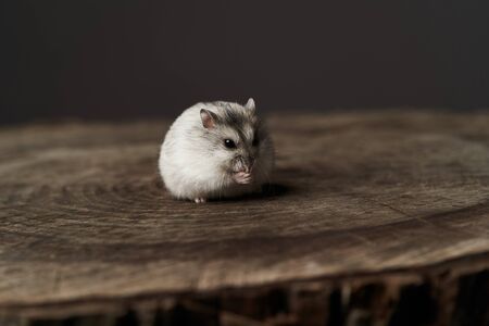 Small domestic hamster. Djungarian Dwarf hamster. Little pet hamster on a wood stump. Rodent