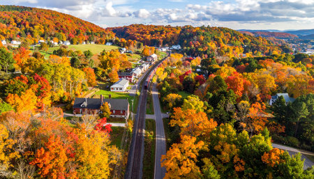 Panoramic view of small town in Vermont during fall season.