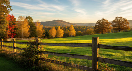 Autumn landscape featuring a rustic wooden fence, vibrant green pasture, and colorful trees under a golden hour sky. peaceful rural scene.