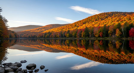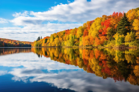 a still lake reflecting the vibrant hues of the autumn foliage, created with generative ai