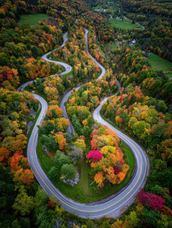 A breathtaking aerial view of a winding road surrounded by vibrant autumn foliage. The scene showcases colorful trees in reds, oranges, and yellows.